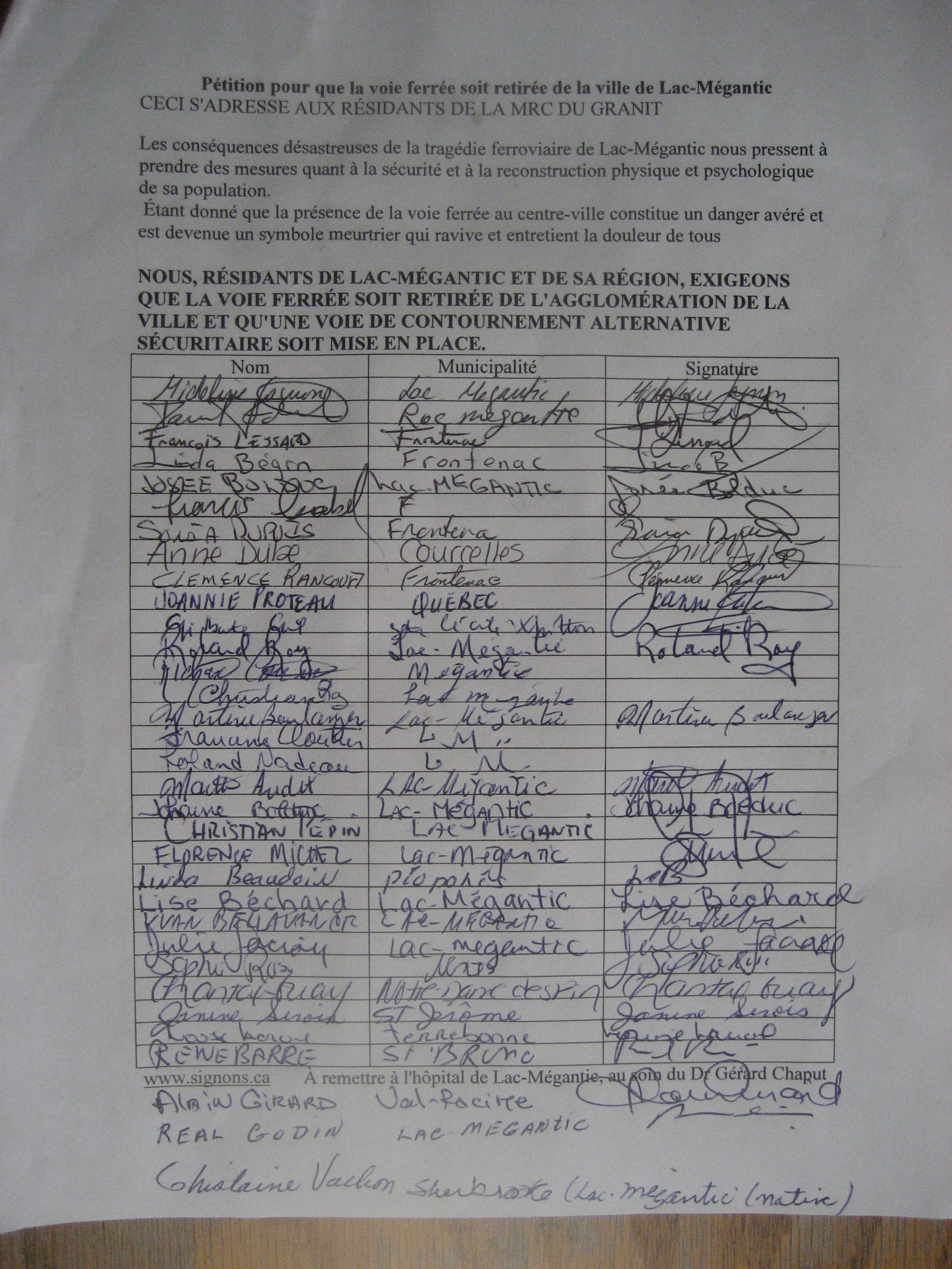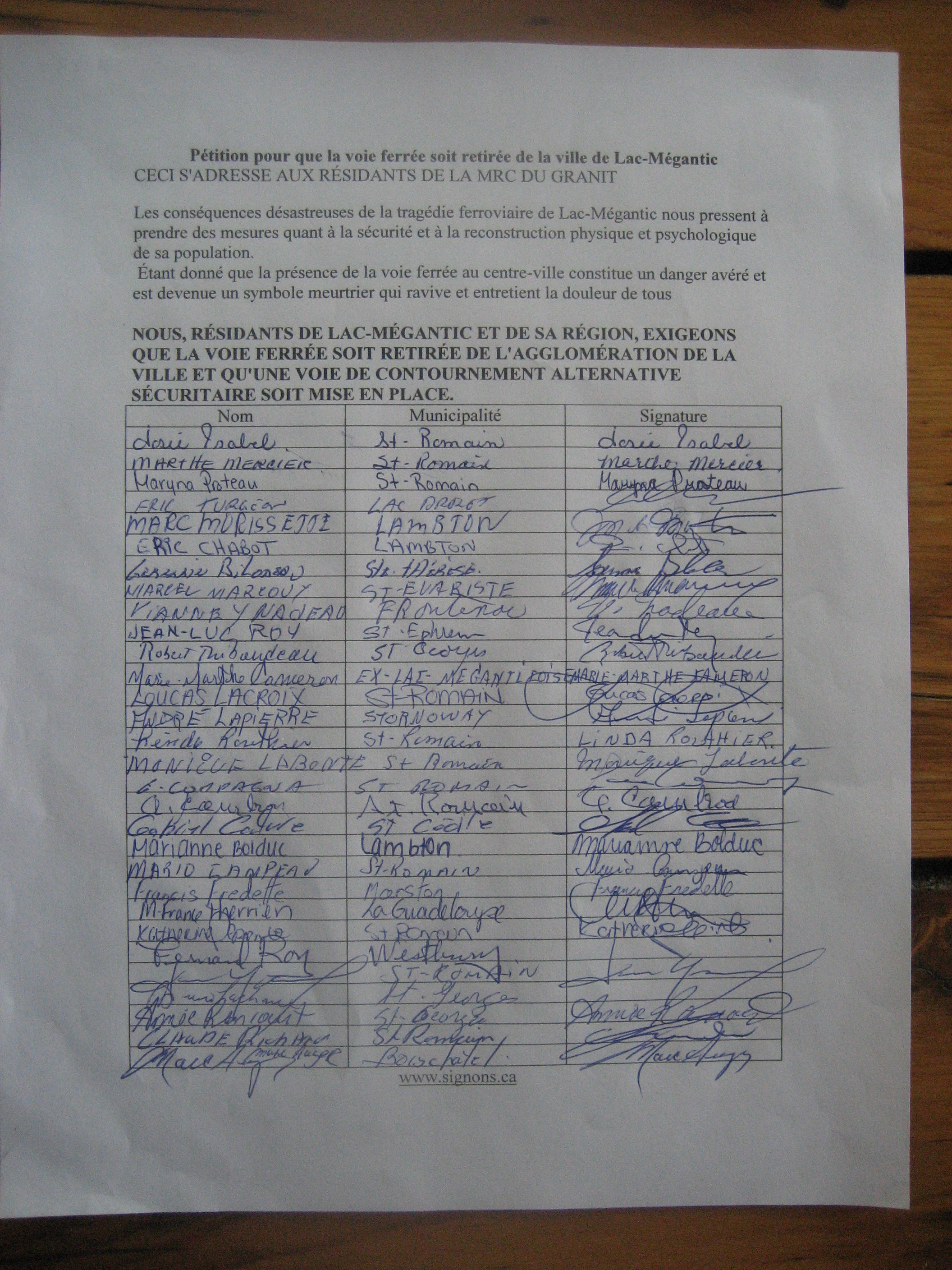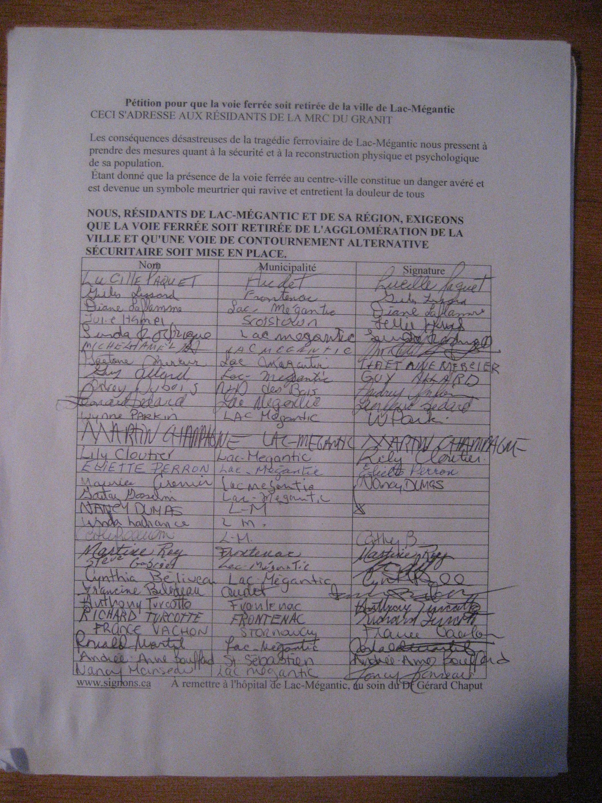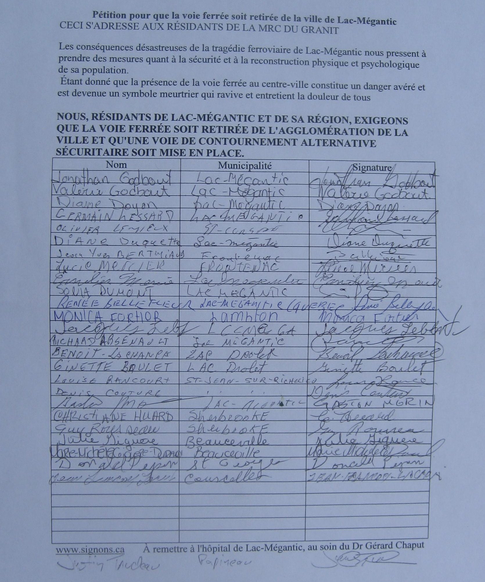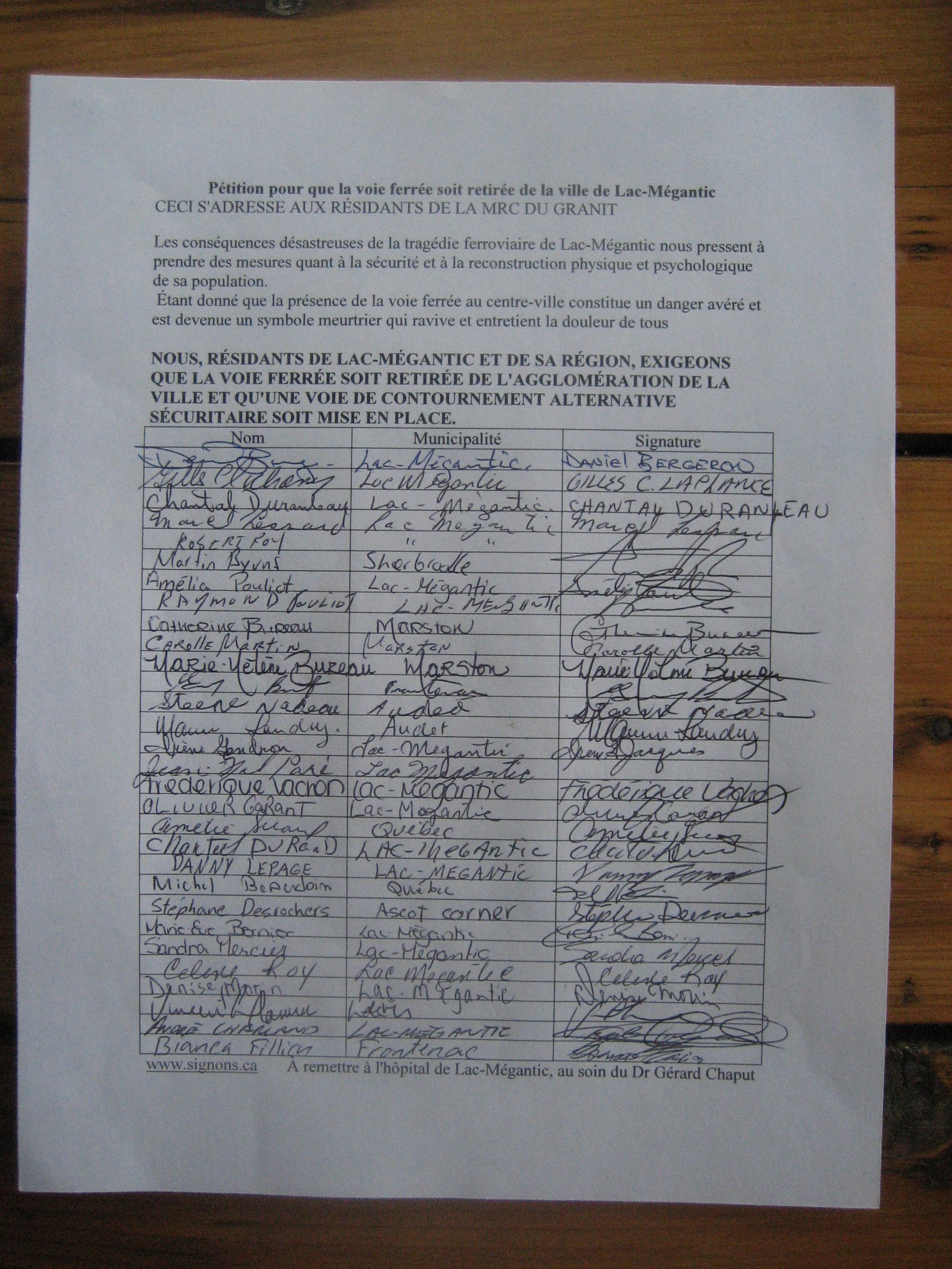 - Pétition pour re-localiser la voie ferrée de Lac-Mégantic