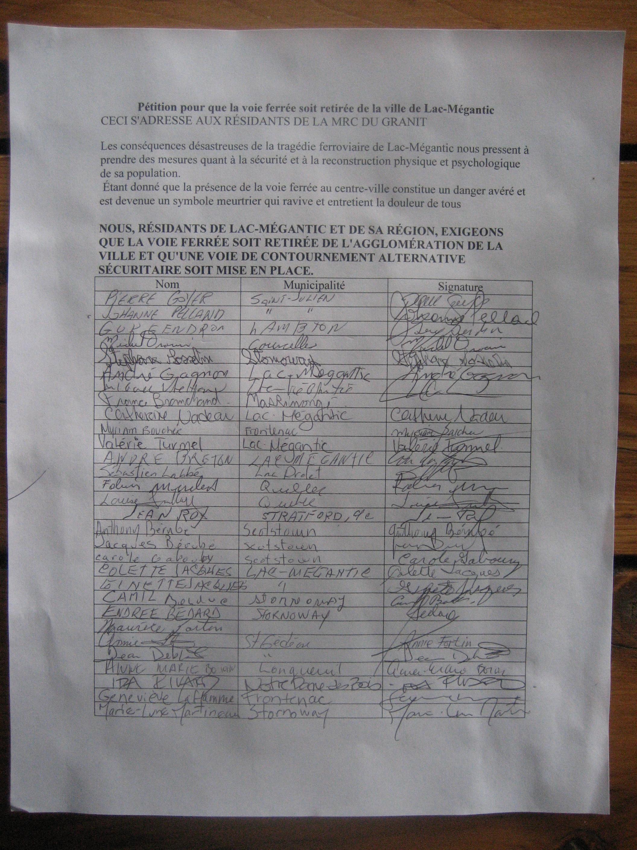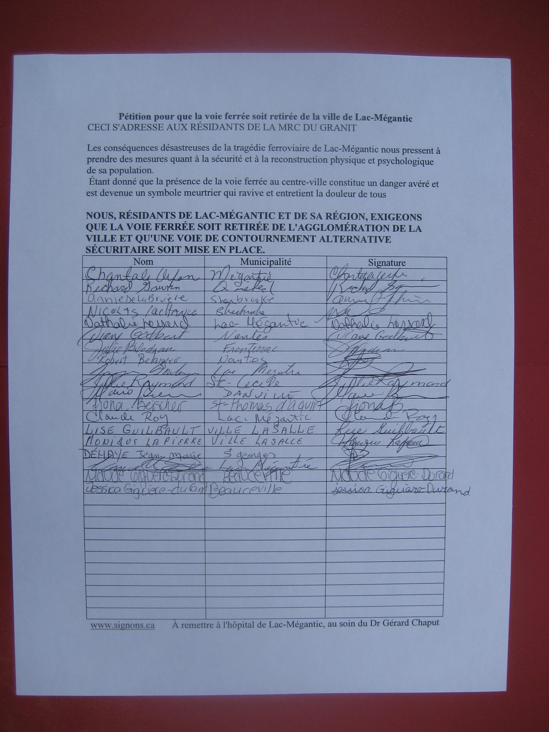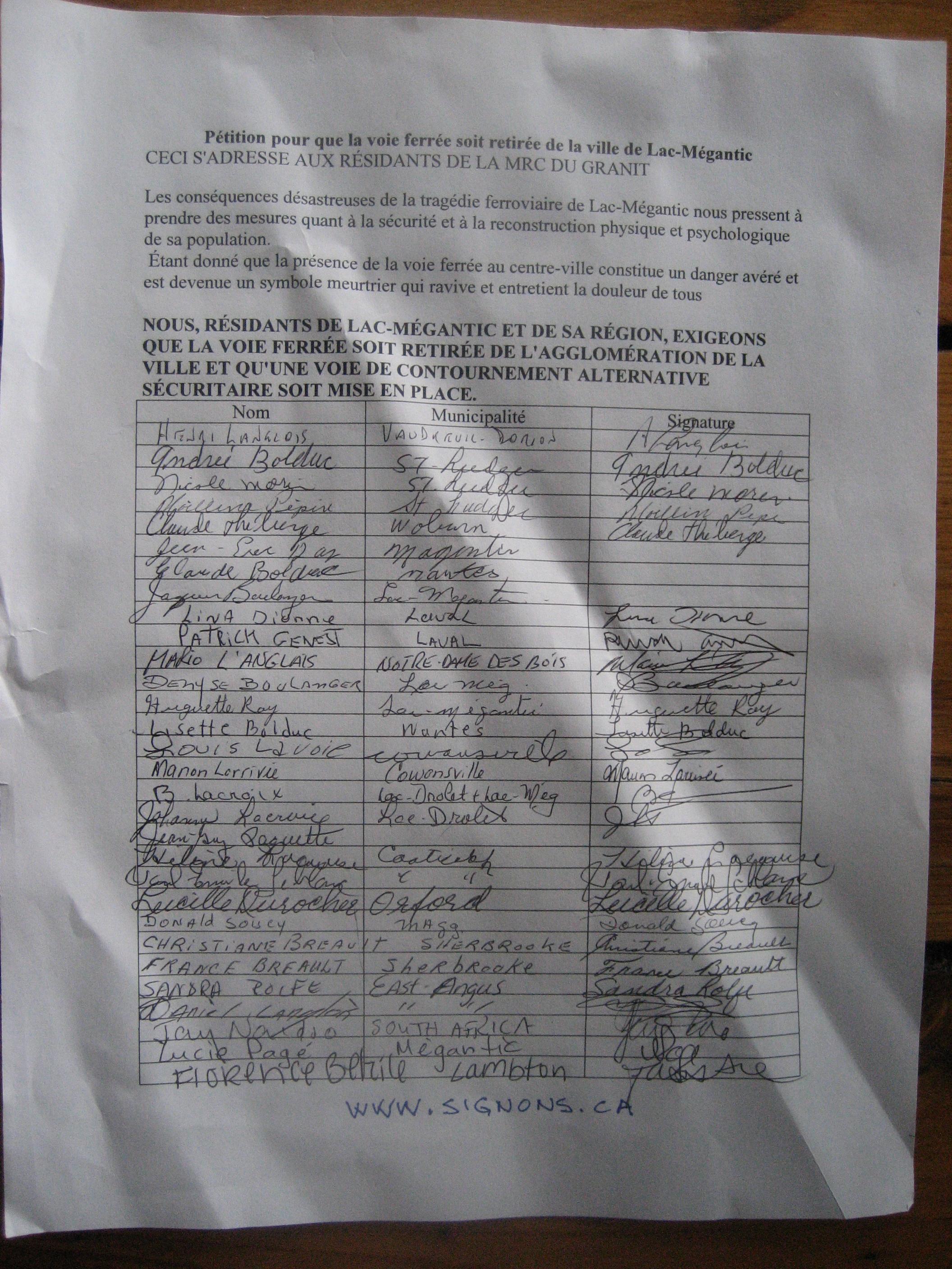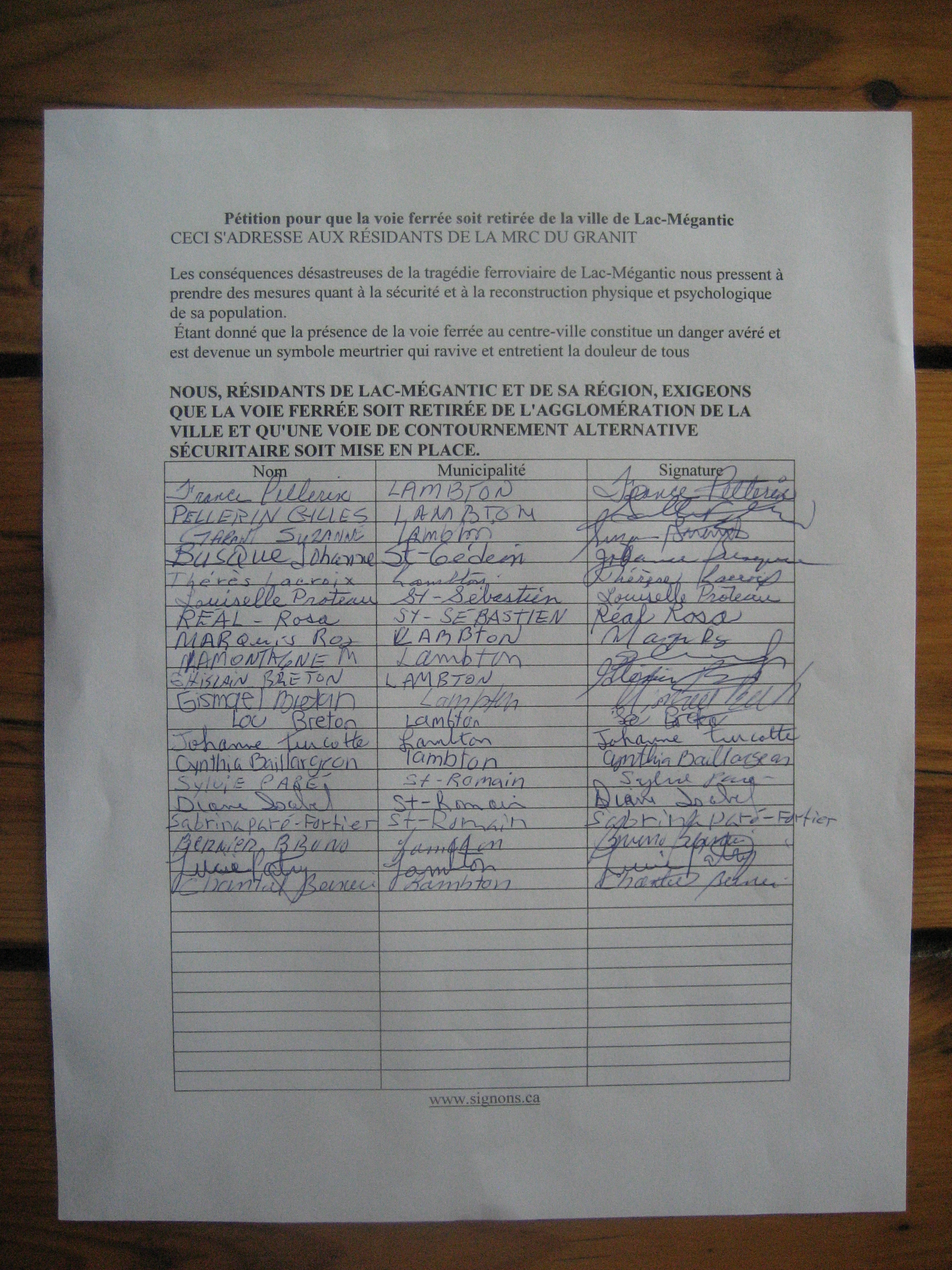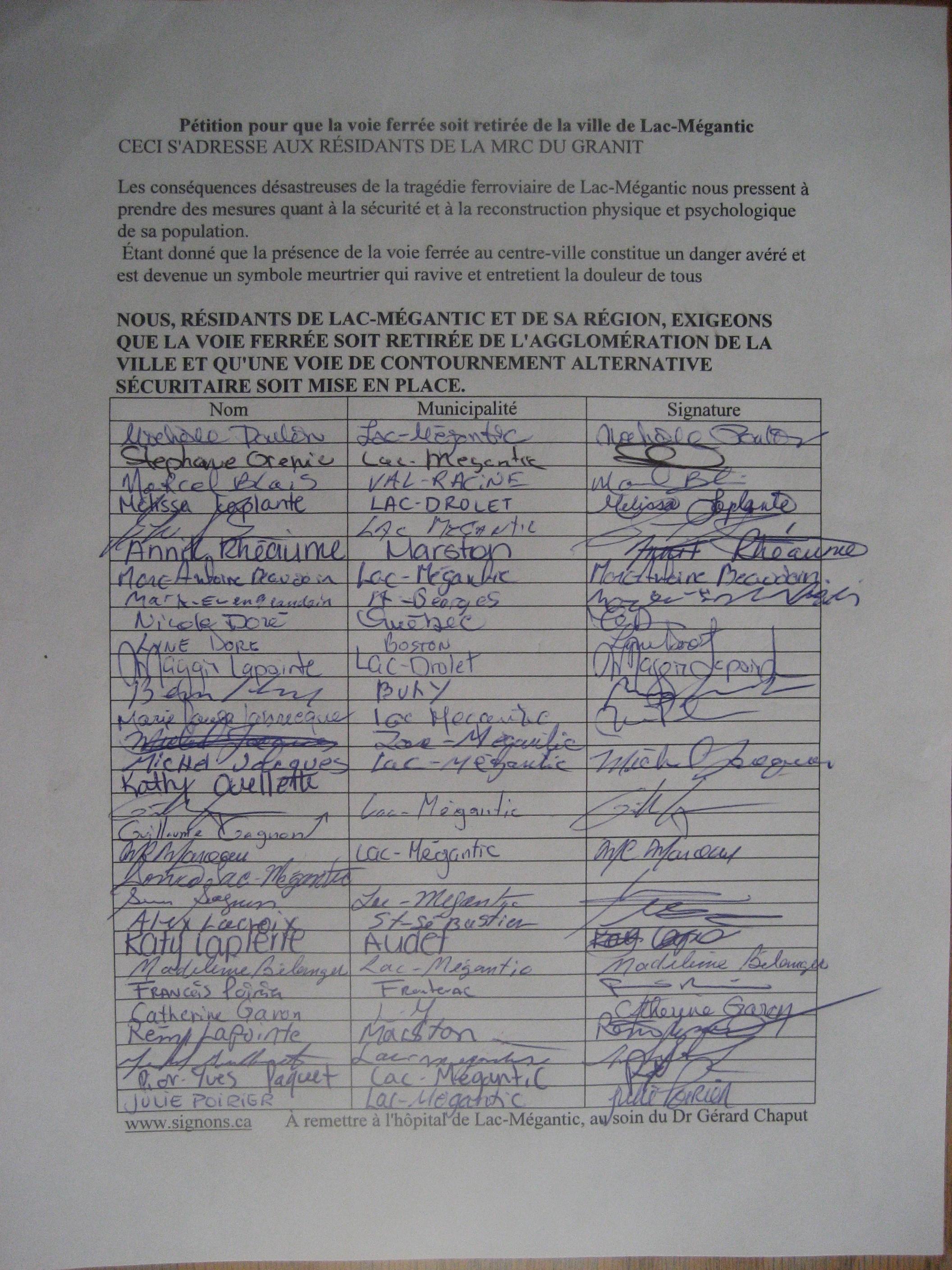 - Pétition pour re-localiser la voie ferrée de Lac-Mégantic