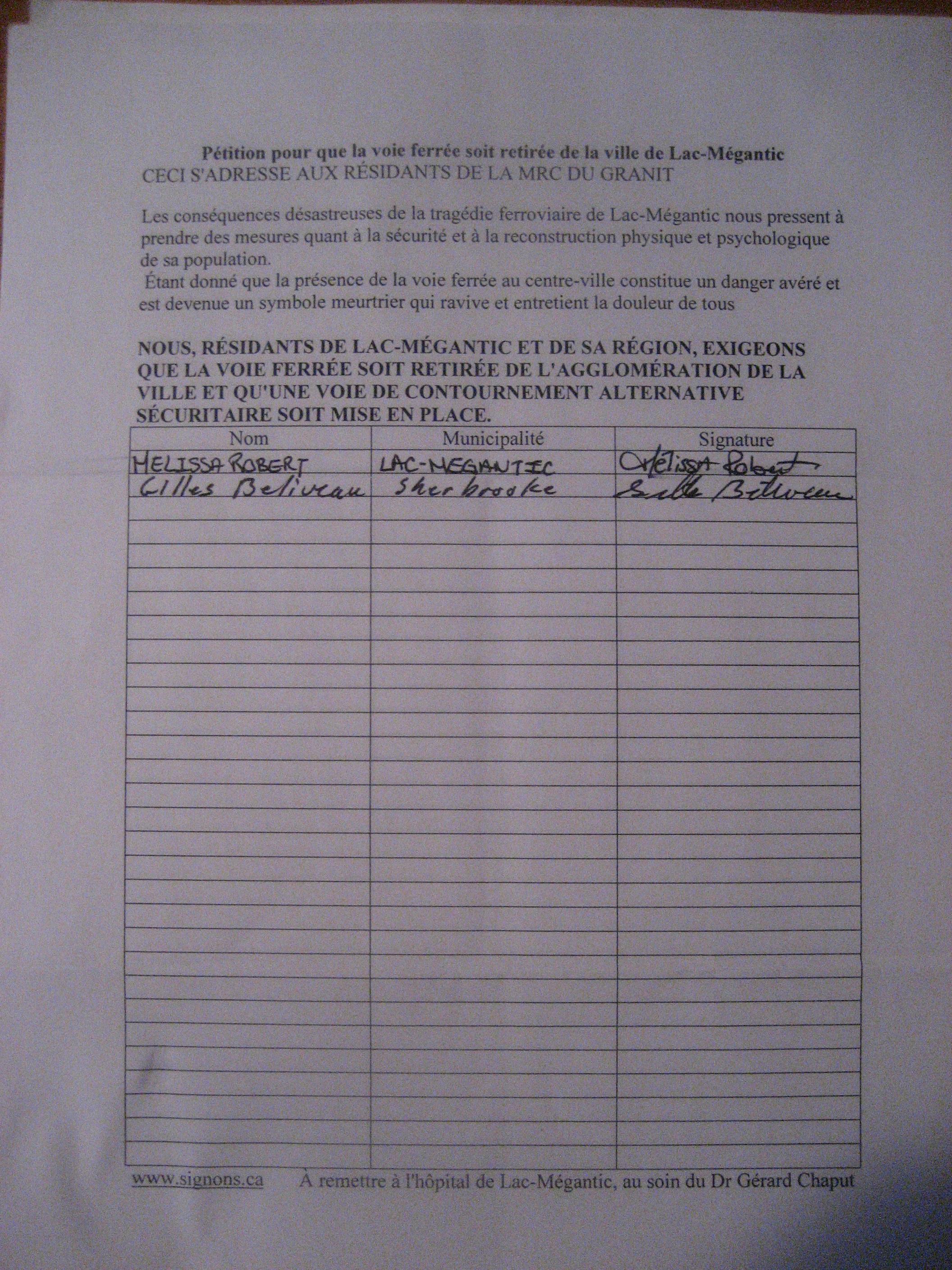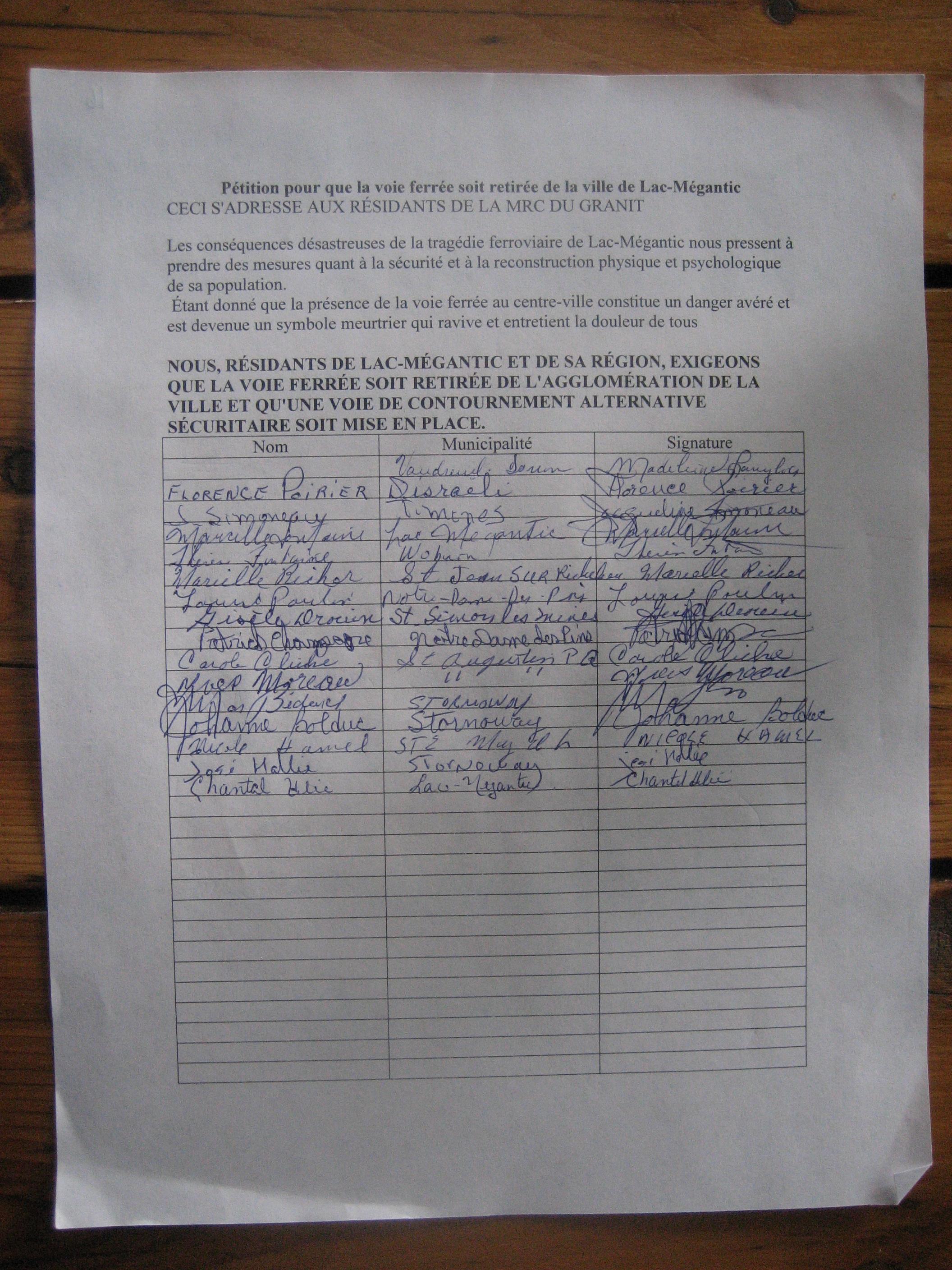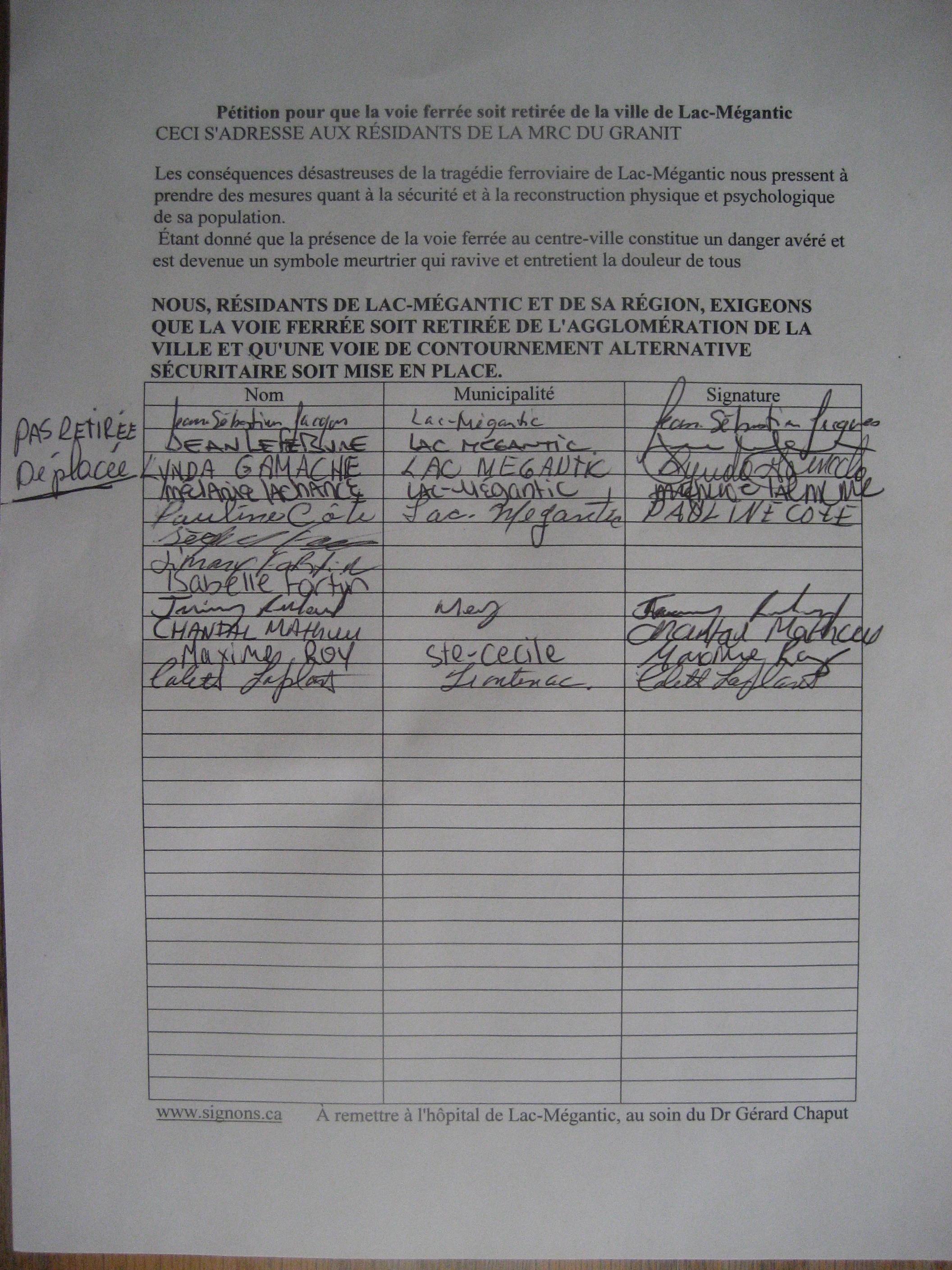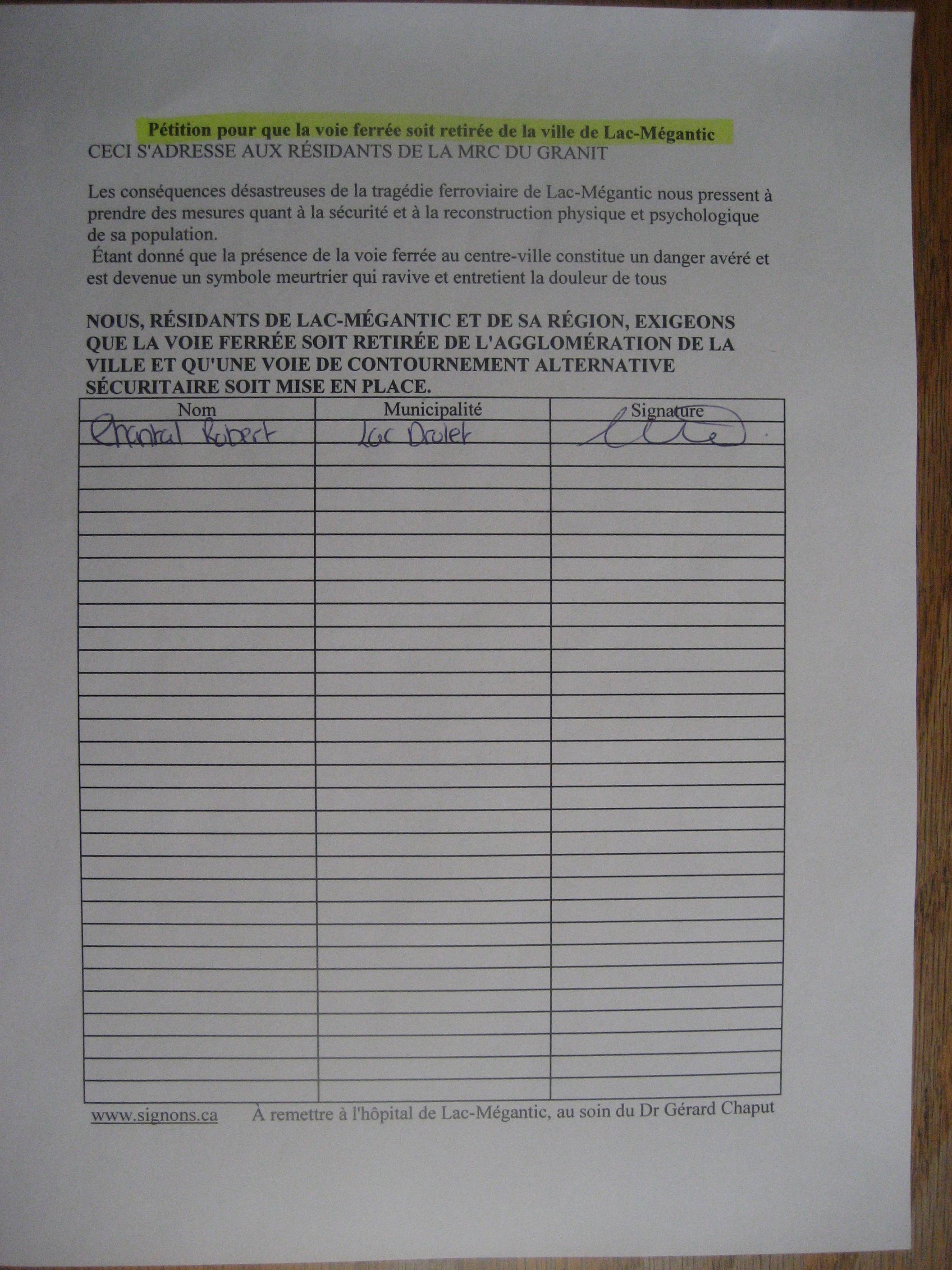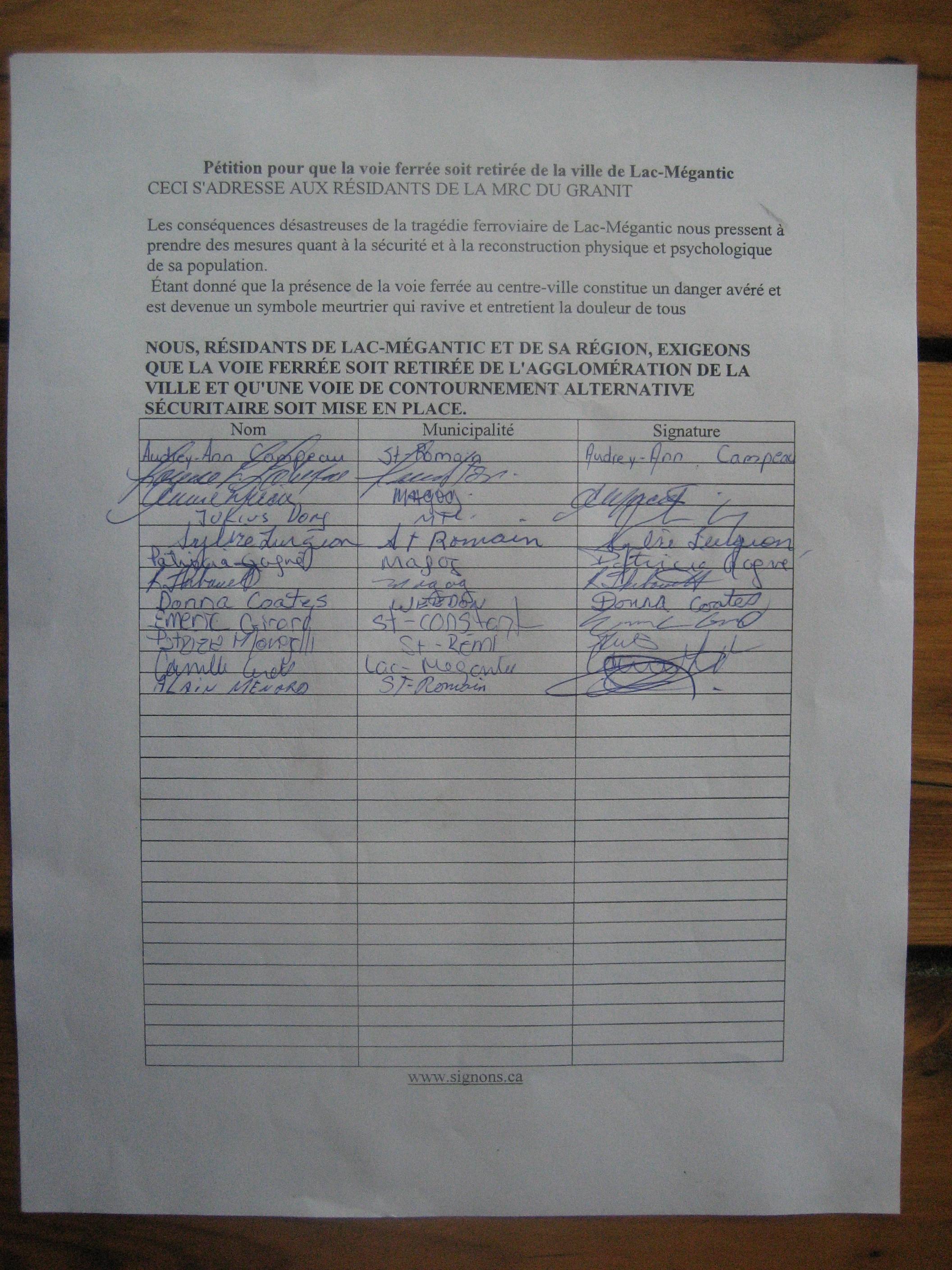 - Pétition pour re-localiser la voie ferrée de Lac-Mégantic